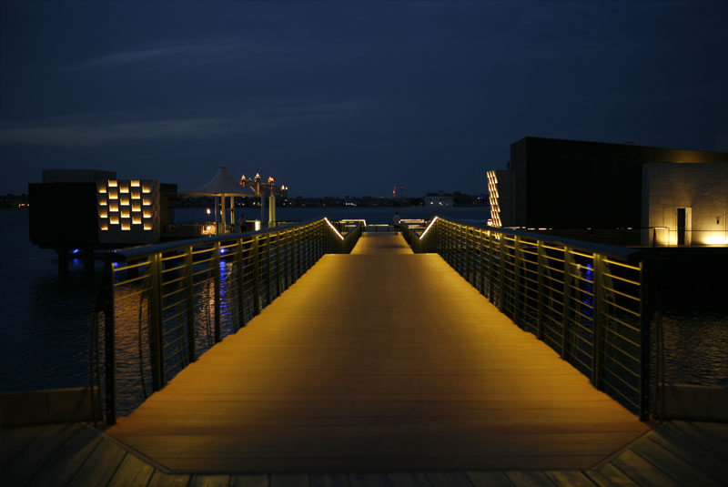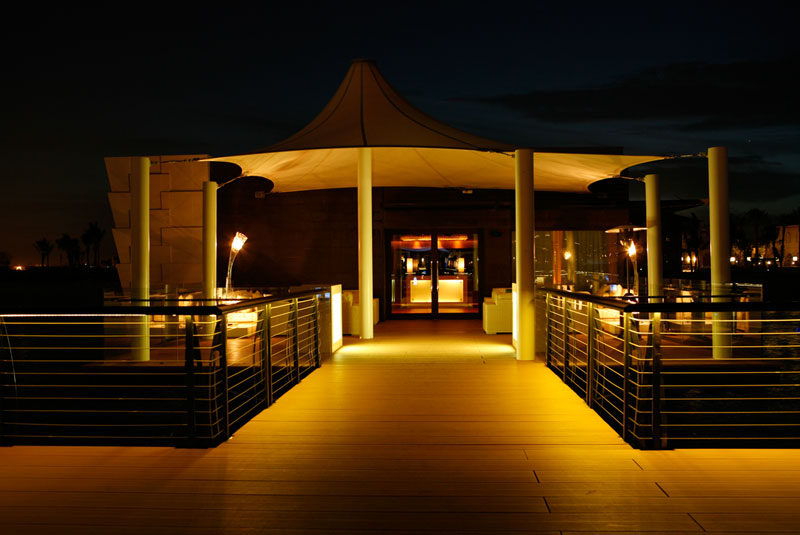 Conceived as a fashionable destination with a very unique identity of its own, the restaurant called for a celebration of its setting on the water, and emphasis on the indoor-outdoor lounge type sensibility. The structure (a tensile roof stretched across a more conventional structure) required the intervention of lighting equipment to be minimal, but with maximum visual impact.