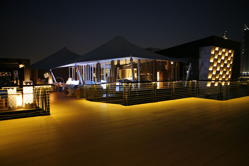 Decorative lanterns fit for use in an external environment adorn the wooden deck around the day-beds and the loungers, which produce perfectly textured light for diners. Candles on top of the tables finish the visual with perfect brilliance.